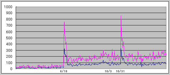 ちなみに、グラフを見ると程無く以前の水準に回復したかの様に見えるかもしれないが、これはたまたまその時期に各種検索エンジンサイトの登録情報を更新し、検索結果の上位に表示される様になっていたからで、根本的に事が解決したという訳ではない。それが証拠に、今もまだ昨年九月末辺りのアクセス頻度までには達していない。